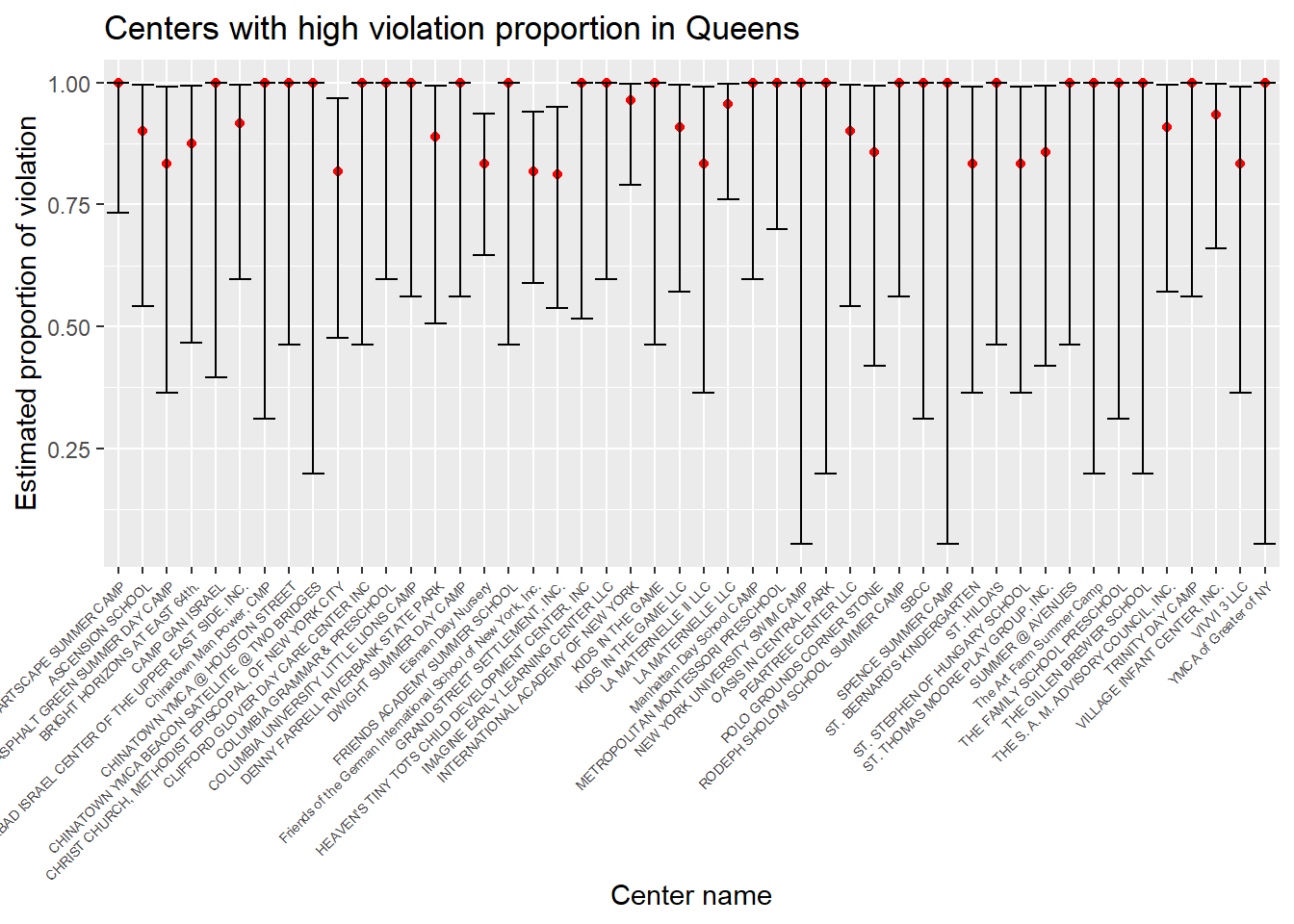 # a plot that shows the estimates and CIs for each center in Queens with violation proportion greater than 0.8