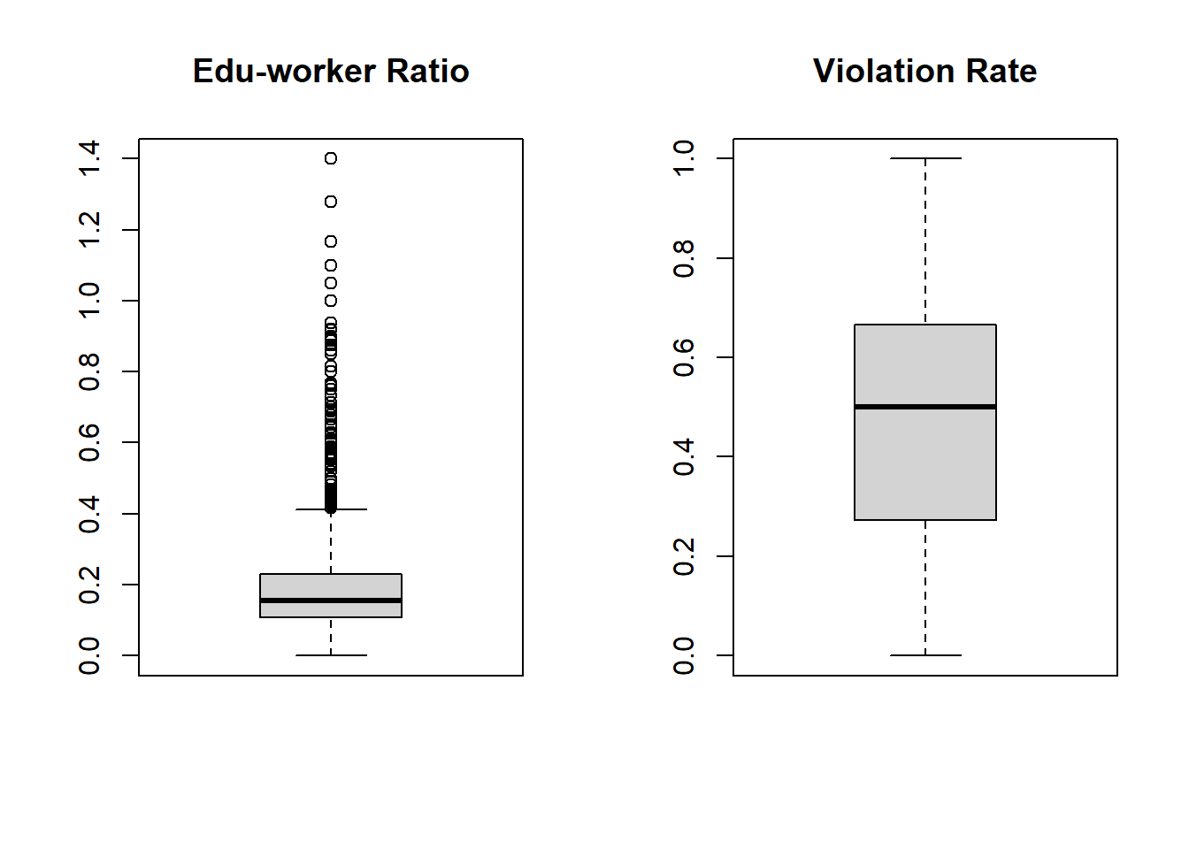 We checked the normality of two numerical variables of educational worker ratio and rate. Boxplot suggests the first variable has a right skewed distribution.