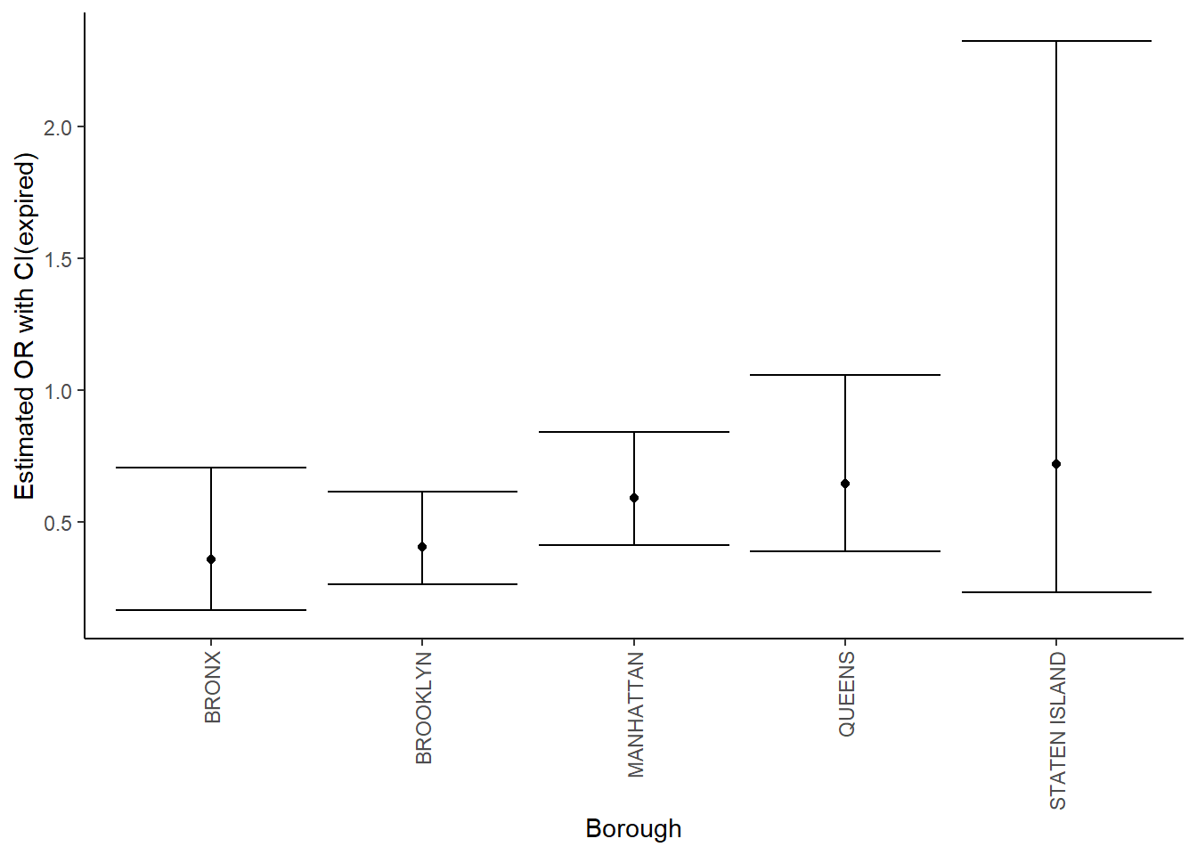 labs(x = "Borough", y = "Estimated OR with CI(expired)")