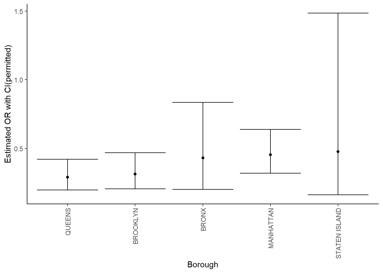 labs(x = "Borough", y = "Estimated OR with CI(permitted)")
